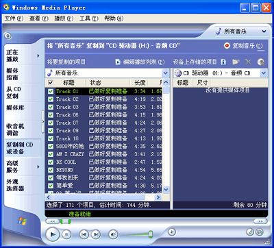 Windows Media Player9中内置了一个CD刻录功能,它可以直接从媒体库中提取音乐文件复制到CD盘上,能刻录出标准的CD。Windows Media Player9提供了多种音质刻录格式。操作起来也非常方便,刻录时首先单击程序主界面的“复制到CD或设备”选项,在“复制音乐”界面中出现左右两个窗口,在左侧窗口上方的“要复制项目”项中选择需要复制的音乐文件,随后选择的文件将显示在左侧文件列表中,其中包括文件名、状态、长度、大小等,在该窗口的下方程序提供了所选歌曲的数目及刻录成CD后所占用的时间长度(图2)。