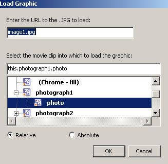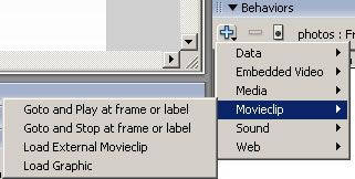 8.下面要开始行为的使用了。首先要将图片image1~image5分别导入到元件photograph1~photograph5中。选中关键帧1,按下“Shift+F3”打开行为面板,点击面板上的加号,在弹出菜单中选择Movieclip→Load Graphic,出现导入图片设置框。