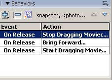15.这时我们在“行为”面板中可以看到设置好的三个行为,但在Event项中可以看出三个行为的触发形式都是On Release(鼠标释放)(图4),与我们的要求是不相符合的。点击Event下的后两个On Release,打开下拉菜单,选择On Press(图5)。