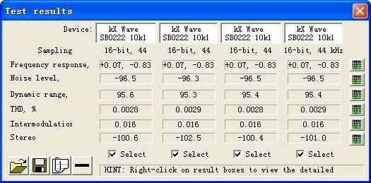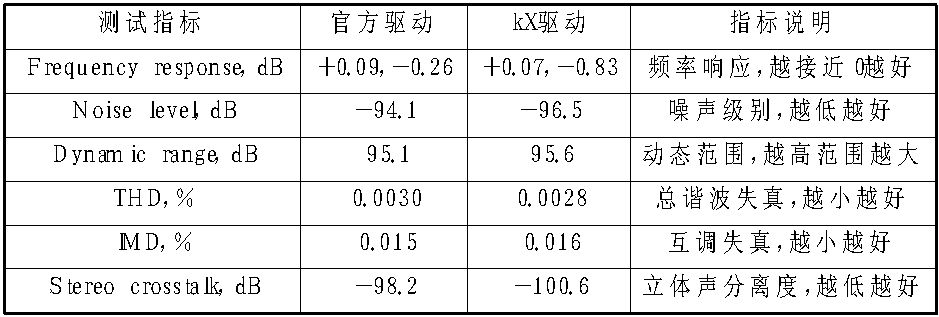 从测试结果图和上表的分析中,我们很容易发现在安装官方驱动时,笔者声卡的测试指标就已经非常不错了。在安装kX驱动后,测试的四个性能指标还都有提升,比如噪声级别从-94.1dB下降到-96.5dB,总谐波失真从0.0030%降到0.0028%等。其他两个指标也保持了相当的水平,这是难能可贵的!