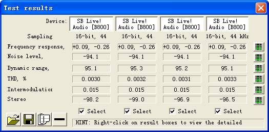 在安装SB Live!的官方驱动和在安装kX驱动后,笔者都分别使用了RMAA 5.1对声卡进行了测试(采用16位,44.1kHz采样率),测试结果分别如图1和图2所示,并对第一组数据进行分析,如下表: