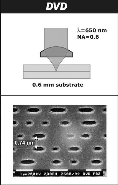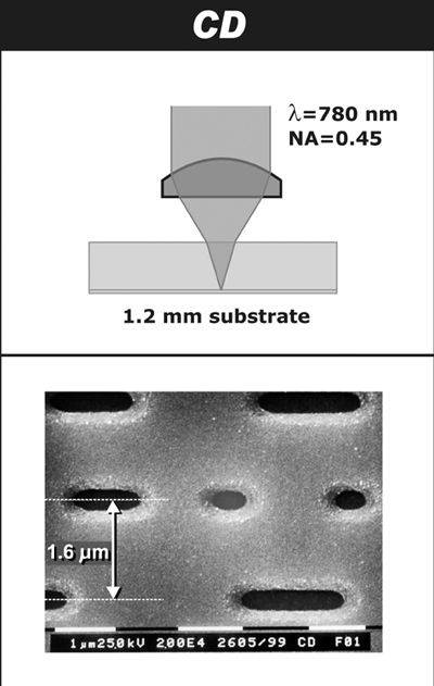 光存储媒体记录数据的方式也许大家早有耳闻,采用一定功率的激光照射盘片,使盘片表面的材质发生变化,形成记录信息的凹坑Pit和平台Land,这样我们要保存的数据就刻录在盘片上了。CD与DVD的记录原理是相同的,但是在实现中两者有很多不同之处,其中较重要的是激光波长与轨道间距两部分。