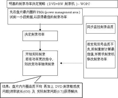 综上所述,如何保证DVD的刻录品质呢?BenQ的DVD+RW刻录机通过一种全新的写入控制技术WOPC (Walking Optimal Power Calibration,激光智导技术) 来解决上述的问题。WOPC技术是在实际刻录过程中,实时侦测刻录品质来直接调整写入激光头功率,保证写入品质。我们可以通过与普通CD-R的刻录过程比较看出WOPC技术的特点(图3、图4)。