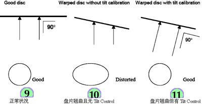 BenQ通过独有的Tilt Control(TC)技术,通过Tilt调整使得激光与盘片的表面始终垂直。无论盘片是否有翘曲等现象,都能保证最优化的信息记录点(如图11)。