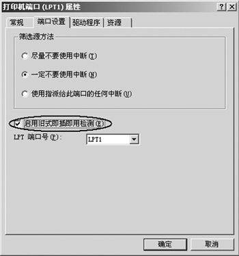 在Win 2000中,右击“我的电脑”,选择快捷菜单中的“属性”打开“系统属性”窗口,选择“硬件”选项卡,单击“设备管理器”按钮打开设备管理器,选择“端口(COM和LPT)”项目,双击“打印机端口(LPT1)”,在出现的属性窗口中,选择“端口设置”选项卡,选中“启用旧式即插即用检测”复选框(如图),最后单击“确定”按钮。重新启动计算机即可。