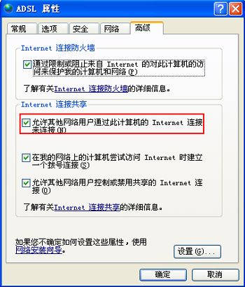 打开“网络连接”,点击创建的ADSL连接属性,在弹出的对话框中选择“高级”标签,如图3所示。在“Internet连接共享”项里,选中“允许其他网络用户通过此计算机的Internet连接来连接”,最后点击“确定”即可。