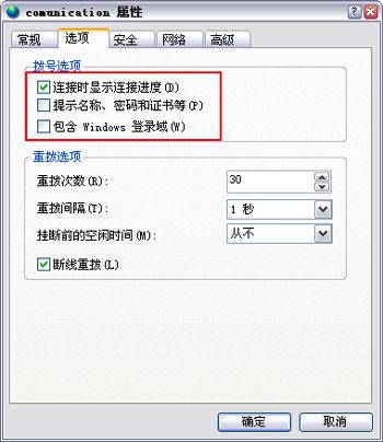 在选项窗口中(图1)取消“提示名称、密码和证书等”复选框,为了可以实时观看拨号时的进度,可以将“连接时显示…”项选中。另外,当连接因不可知原因而断掉后,可以让程序自动拨号,我们可以选中“断线重拨”,然后将“重拨次数”项后面的数值设置大点,再将重拨间隔的时间值设置得小点,这样,一旦遇到掉线的情况,程序会自动迅速地完成拨号。