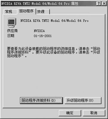 NVIDIA的早期部分驱动程序不像现在的“雷管”驱动有“Setup”,可以直接安装,它需要手动安装。它的安装方法如下:右击“我的电脑”,点击“属性”,弹出“系统属性”对话框,点击“设备管理器”,选中“显示适配器”“NVIDIA RIVA TNT2 Model64/Model64 Pro”。再点击“属性”,弹出“NVIDIA RIVA TNT2 Model64/Model64 Pro属性”对话框,点击“驱动程序”选项卡(如图)。点击“升级驱动程序”后,会弹出“升级设备驱动向导”。点击“下一步”,选择Windows推荐的自动搜索,点击“下一步”,选取“指定位置”,再点击“浏览”选择驱动程序所在的文件夹,再单击两次“下一步”,即可完成驱动安装。重启后,显卡可用。以此类推,所有没有“setup”文件的驱动程序都可应用此法,只需要在“设备管理器”中选中相应的设备。