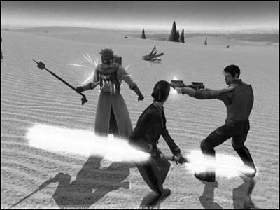 这很难说,因为BioWare已经在《无冬之夜》中,证明了他们在改善角色扮演过于平静这一点上做出的努力。现在他们要做的,只是让手持光剑和射线枪打斗看上去合情合理而已。既然角色在《无冬之夜》中已经摆脱了你一刀我一刀的陈腐,并时不时做着实质上对游戏完全影响的闪躲动作,那么为什么在KotOR中就不能呢?尤其当它还是以光剑打斗优雅非凡著称的时候。