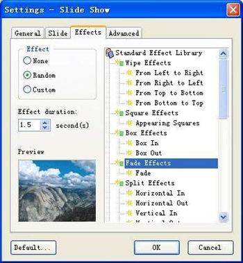 Slide Show Pilot是一个功能强大操作简便的图片幻灯显示工具,使用它,我们可以以20多种显示特效来播放图片幻灯,而且我们可以为它加上背景音乐,将图片和音乐打包成可执行文件或屏幕保护程序、自动生成Autorun.inf文件等。