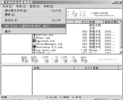 学英语最好的方法就是每天背几个或几十个单词或句子,这里就可以利用MP3的录音功能了。其实很简单,就是把你今天所要背的单词读一篇,让MP3录下你的声音,然后播放听一下声音是否标准。或者你可以把你所录下的声音,上传到电脑,方法是:打开艾利和随机送的管理程序,按“文件”,REC→音乐文件(WAV,MP3)(图2)。