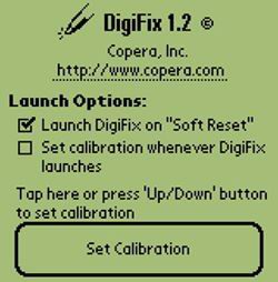 Digifix是一个Palm掌上电脑的应用程序,大小只有14KB。将这个Digifix.PRC文件同步到Palm掌上电脑中后,屏幕上会出现图标(icon.jpg,如图)。用触笔点击这个图标就可以进入Digifix的设置界面(main.jpg)。在设置界面中可以通过Palm掌上电脑的“上/下”按钮来调用屏幕校准程序,用户就可以和使用Palm OS内建的屏幕校准来进行屏幕校准。