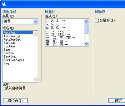 首先在“类别”下拉列表中选择希望插入的域的类别,如“编号”、“等式和公式”等。选中需要的域所在的类别以后,“域名”列表框会显示该类中的所有域的名称,选中欲插入的域名(例如“AutoNum”),则“说明”框中就会显示“插入自动编号”,由此可以得知这个域的功能。对AutoNum域来说,你只要在“格式”列表中选中你需要的格式,单击“确定”按钮就可以把特定格式的自动编号插入页面。如图1所示。