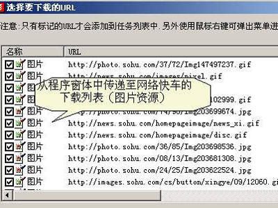 网际快车和网络蚂蚁在下载全部链接时均无法批量下载以“<IMG>”标记方式直接嵌入网页的图片,仅能使用下载单个链接的方法逐一下载,效率大为降低。本实例通过自行编制脚本程序实现了IE右键菜单的扩展开发,运行后对包含链接的网页进行下载全部链接操作时,其下载列表中不仅添加所有的链接,还可添加所有的页面图片,网际快车的效果如图1所示: