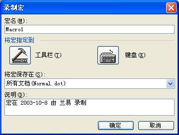注意:录制“宏”时可使用鼠标单击菜单和按钮,但无法录制鼠标在文档窗口中的移动,因此必须通过键盘来实现这些动作。此外,Office中所有录制的“宏”,其名称的首字符必须为字母或汉字、数字及下划线(名称最多可为255个字符),且“宏”名称中不允许包含空格。