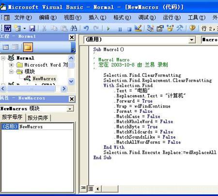 虽然“宏”存在很多局限性,但通过录制“宏”获取了VBA代码后即可通过VBA编辑器来为代码添加逻辑控制并设计流程等。以Word 2002为例,“宏”录制完成后,可在运行宏对话框中选择录制的宏并单击“编辑”按钮,即可显示VBA编辑环境,如图2所示。