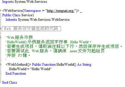 在Web Service中,每个.asmx页面后面都有一个类。这个类就是HelloWorld方法所在的,从图2的显示代码: