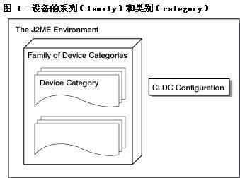 J2ME体系结构基于设备的系列和类别,一个类别定义了一个特定种类的设备。移动电话、寻呼机和个人电脑记事本都是单独的类别。对存储器和处理能力有相近需求的若干类别的设备构成设备的一个系列。移动电话、寻呼机和个人电脑记事本一起就是占用资源很小的设备的一个系列。图1定义了在J2ME环境中设备的系列和类别之间的关系。