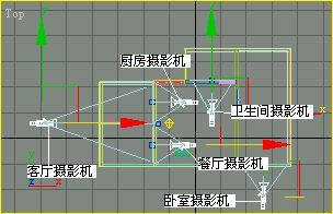 (1)单击命令面板上的“Create”(创建)按钮,进入创建命令面板,单击“Cameras”(摄影机)按钮,在打开的设置面板中单击“Target”(目标摄影机)按钮,在Top(顶视图)视图中客厅的位置附近先架起一个摄影机,将其命名为“客厅摄影机”。然后依次在卫生间、卧室、厨房、餐厅4个房间各架设一个摄影机,分别将其命名为卫生间摄影机、卧室摄影机、厨房摄影机和餐厅摄影机,摄影机的具体位置如图3所示。