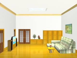 第三,制作客厅效果图。我们首先要做的就是将客厅的吊顶、门窗、边角修饰等制作好,然后在室内放置什么物品、摆在什么位置,做到心中有数,将模型一一建造好以后就可以按照我们的想法进行摆设。这里需要说明的是,我们在每个模型设计制作完成以后,都要将它们的贴图材质一并设计制作好。同时,墙壁用什么颜色、地板用什么颜色、用什么样的灯具、天花板怎样设计,都同样做到心中有数。模型和材质制作完成以后,我们还需要为房间设计制作灯光效果。最后就可以进行测试渲染了,对不满意的地方,如物品的摆放、材质、灯光等,可以进行进一步调试,直到满意为止。