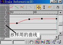 (2)进入“Modify”(修改)命令面板中,打开“Deformation”(变形)选项,单击“Scale”(放缩)按钮,在打开的对话框中加入几个控制点,然后进行调整,放样的线型及调整点的形状如图15所示。