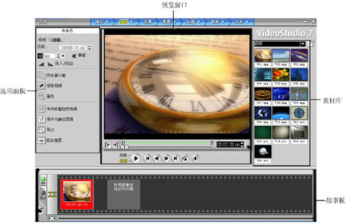 现在,影片剪辑工作已经初步完成。在编辑影片时,常常需要预览工作结果,以了解项目的进展情况。你可能已经注意到了,在前面的操作中,每次单击预览窗口下方的“播放”按钮,只会播放所选择的一个视频片断。实际上,《会声会影7.0》是可以预览故事板中的整部影片甚至影片中一个指定的部分。
