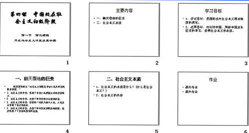 首先,我们来设置课件的自定义放映效果。如课件中可分出“引入新课”“新授之一:翻天覆地的巨变”、“新授之二:社会主义本质”、“课堂作业”、“课堂小结”和“课外作业”等6个部分,把他们定义为6个放映。