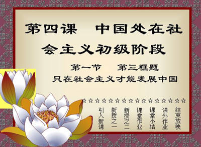 当你启动PowerPoint 2003时,程序实际上已为你创建了一个名为“演示文稿1”的新文件,并有一个默认的文字版式供你直接使用,你可以在其中输入新课件的大标题和小标题(或副标题)(本文以初中政治“第四课 中国处在社会主义初级阶段”中的“第一节 第三框题 只有社会主义才能发展中国”为例),在大标题中输入“第四课 中国处在社会主义初级阶段”,在副标题中输入“第一节 第三框题 只有社会主义才能发展中国”。