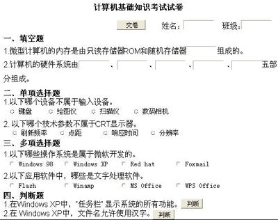 下面我们将使用PowerPoint制作一个带有填空题、单项选择题、多项选择题、判断题的机答试卷,只需单击“交卷”按钮,即可弹出一个消息对话框,显示出你的姓名、答题情况。