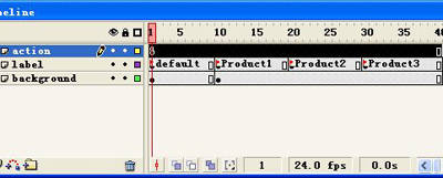 (3)单击时间轴面板上的插入图层按钮在时间轴上增加一个新层,并将其命名为action。同样的操作,添加label和background层。