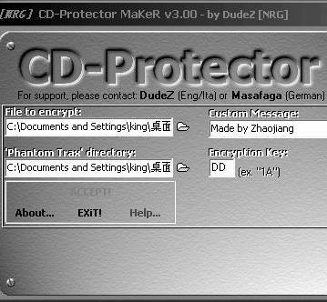 (1)运行CD-Protector,在主界面中分别设置“File to encypt”(需要加密的文件)、“Custom Message”(出错提示信息)、“Phantom Trax directory”(输出保存路径)等选项,同时在“Encryption Key”(编密码)对话框中输入00~FF的两位字符串作为加密密钥。如下图所示。