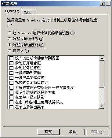 选择桌面上“我的电脑”图标,单击鼠标右键,在弹出的快捷菜单中选择“属性”命令,打开“系统属性”对话框。选择“高级”选项卡,在其中的“性能”栏中单击“设置”按钮,会弹出 “性能选项”对话框(如图4),可选择“调整为最佳性能”单选框来关闭所有的视觉效果,也可选择“自定义”然后选择自己需要的视觉效果。