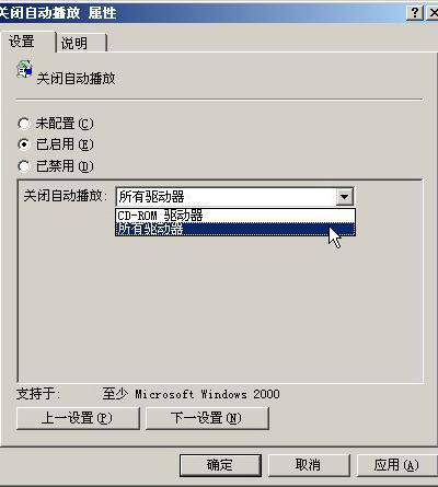 运行“组策略”程序。在组策略窗口左边栏中,打开“计算机配置”,选择“管理模板”下的“系统”,然后在右边的配置栏中找到“关闭自动播放”并双击它,会弹出“关闭自动播放属性”对话框。在其中“设置”选项卡中选择“已启用”,“关闭自动播放”下拉列表中选择“所有驱动器”(如图6)。这样以后就不用担心Windows XP的“自动播放”功能带来的麻烦了。