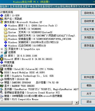 Windows优化大师的自动优化的功能提供了一种简单的优化方式,这种优化针对的是大多数用户最常用的项目进行优化,而且完全不用人的干预。