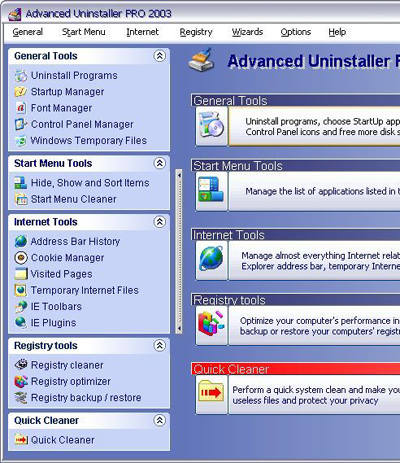 Advanced Uninstaller PRO 2003采用模块化设计,启动后各项功能全部清晰地列在左边的五个工具窗格中(如图9):“General Tools(常规工具)”窗格中包括了程序卸载,启动、字体、控制面板管理器;“Start Menu Tools(开始菜单工具)”中包括了开始菜单的管理与清理功能;在“Internet Tools(因特网工具)”中除了提供了IE历史记录清除,Cookie管理外,还包括对已访问页面、Internet临时文件、IE工具栏、IE插件的清除管理功能;“Registry Tools(注册表工具)”中则提供了注册表清理、优化、备份还原等功能;使用“Quick Cleaner(快速清除器)”可快速删除常用项目并能对几十种常用软件进行快速卸载。