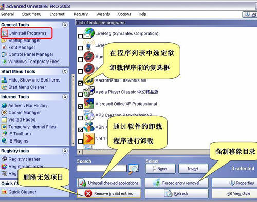 在“General Tools”窗格中单击“Uninstall Programs”,然后在右边的程序列表中选择要卸载的软件(如图10),选好后,单击“Uninstall checked applications”可以通过软件自带的卸载程序进行卸载,选择“Forced entry removal”按钮,将会强制删除软件的目录。相比Windows的“安装或卸载程序”,这里可以同时选定多个软件进行卸载,并能通过删除软件目录来对软件进行强制删除,还能清除掉程序列表中的无效项目。