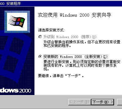 全新安装:是指保留原有系统的情况下进行的安装,以这种方式安装Windows 2000/XP后就可以得到我们所需要的双操作系统了。由于Windows 2000/XP不支持直接从Windows 98升级,所以在向导界面中“升级安装”的选项默认状态下就已经是灰色的了(即不可选状态)。所以我们只能选择“全新安装”方式。如图2所示。