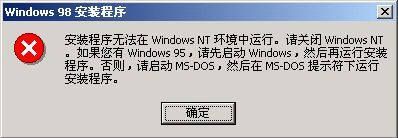 这是比较少见的一种安装顺序,所以安装的过程也略有不同,首先应该注意的是采用这种方法时,硬盘的C区绝对不能为NTFS格式。如果分区格式为FAT32,那么就可以直接通过光盘启动的方式引导计算机来安装Windows 2000/XP到C盘;在系统安装完毕后是不能直接在Windows 2000/XP中直接运行Windows 98安装程序的,否则将会出现错误提示。如图3所示。