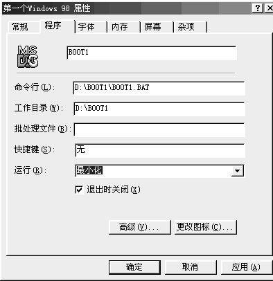 创建BOOT2. BAT快捷方式。在桌面单击鼠标右键,选择“新建→快捷方式”命令,输入源文件路径“C:\boot2\boot2.bat”,将BOOT2. BAT快捷方式命名为第二个Windows 98,再用右键单击第二个Windows 98,选择“属性→程序”命令,在“运行”中选择“最小化”选项,再选中“退出时关闭”选项,然后单击“确定”按钮。现在运行这个快捷方式,就可以启动到第二个Windows 98了。