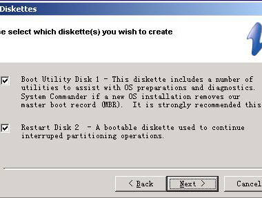安装向导将会建议用我们创建系统启动引导盘,程序提供的机器启动引导盘包括“Utility Disk 1”和“Restart Disk 2”两张,其中前者包括了管理硬盘分区的程序文件,以及备份文件。后者包括了有关当前的系统引导信息,如果操作过程中由于断电或复位而导致的引导失败可使用这个备份纪录恢复机器的引导纪录。程序强烈推荐创建“Restart Disk 2”。在此需要说明的是,由于程序提供的备份盘中会包括SC的引导文件及硬盘引导纪录,在此强烈建议创建,即选择界面中的“Make both diskettes”。如图21所示。