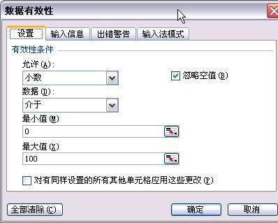 对图1所示的工作表而言,可以在工作簿共享之前设置“数据有效性”。因为每个用户输入的成绩通常在0至100之间,此时应当选中C2:H11区域。单击“数据”菜单中的“有效性”命令,打开“数据有效性”对话框(如图2)。在“设置”选项卡中打开“允许”下拉列表,从中选择选中区域要输入的数据类型(小数)。接着打开“数据”下拉列表,选择你要输入的数据范围逻辑,如介于、小于、大于或等于等等。这里应该选择“介于”,然后在“最小值”和“最大值”框输入数据的上下限“0”和“100”,最后单击“确定”按钮完成设置。以后如果共享用户输入的数据超过了设定的上下限,就会弹出“输入值非法”窗口。