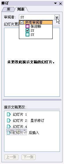 如果你要查看某个用户对演示文稿的修订,可以单击如图28中的“审阅者”下拉按钮,在菜单中选择审阅人的姓名。此后他对演示文稿所作的修改就会显示在如图28下面的“演示文稿更改”框中。鼠标单击该框中的某个幻灯片修订标记,对应的幻灯片就会显示在PowerPoint 2003窗口中间。