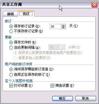 由于共享工作簿允许每个用户设置数据筛选和打印的方式,而且默认保存每个用户的上述设置。如果希望由共享工作簿的设计者进行筛选和打印设置,并且在其他用户打开工作簿后就能使用。可以单击“工具”菜单中的“共享工作簿”命令,打开“共享工作簿”对话框中的“高级”选项卡,清除“在个人视图中包括”下面的“打印设置”或“筛选设置”复选项即可。