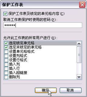 接下来再次单击Excel“工具→保护”子菜单下的“保护工作表”命令,打开对话框(如图5)在“取消工作表保护时使用的密码”框内输入密码,“确定”后关闭对话框,这样未经授权的用户就不能随意取消或更改访问权限。