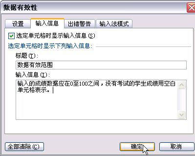 如果你想取消某个单元格或单元格区域的输入提示,只要选择“输入信息”选项卡,单击其中的“全部清除”按钮即可。