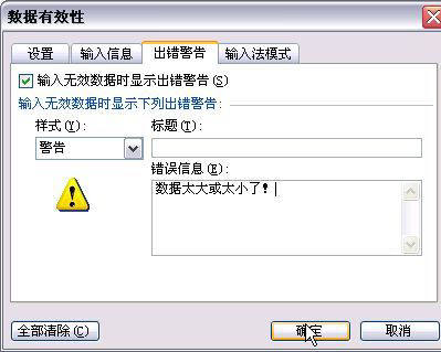 警告方式选择完成后,在“标题”框内输入可选的警告标题,再在“出错信息”框内输入发生错误的原因及如何纠正的内容。完成后单击“确定”按钮。以上设置完成后,只要在具有出错警告的区域内输入了错误数据,Excel就会按设定方式对用户提出警告。