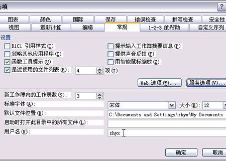 编辑共享工作簿的方法比较简单,用户只要在“网上邻居”中找到保存共享工作簿的共享文件夹,然后按常规方法打开共享工作簿就可以开始编辑了。由于公用电脑中安装的Excel可能有许多用户,为了便于共享和修订记录正确识别用户,建议每一个用户打开共享工作簿以后重新设置用户名。也就是单击“工具”菜单中的“选项”命令,打开“选项”对话框中的“常规”选项卡(如图10),在“用户名”框中输入将要编辑工作簿的用户名称。