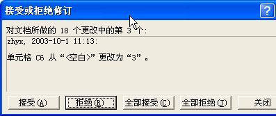 与Word不同,Excel 2003修订的对象只能是共享工作簿,并且在修订之前打开了修订跟踪。只要满足以上两个条件,所有用户对工作簿的修订就会被记录下来,以便在定稿时接受或拒绝这些修订。