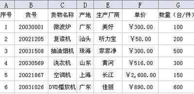要想使Excel 2003工作表被Access 2003快速调用,我们创建的工作表结构必须是“数据清单”。创建标签数据清单的方法是:运行Excel 2003打开一个空白工作表,在A1、B1、C1等单元格输入标签的列标题,例如“序号→货号→货物名称→生产厂家”等等(如图22),它们作为数据库字段被Access 2003识别和调用。完成后就可以输入数据,保存为Excel文件等待调用。