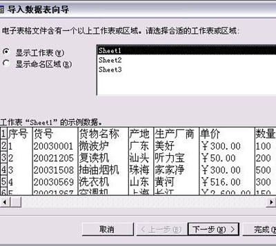 第一步选择存放工资数据的工作表,选中后表中的数据会显示在向导的下方。第二步要选中向导中的“第一行包含列标题”,单击“下一步”按钮继续。第三步让你选择数据的保存位置,由于我们还没有创建新表,必须选中“新表中”继续。第四步选择将要导入Access表的字段,由于我们需要全部导入,只需单击“下一步”按钮继续即可。第五步选择是否定义“主键”,由于没有使用Access的查询等功能,可以选中“不要主键”然后单击“下一步”。最后,向导要求你在“导入到表”对话框中输入表的名称(例如“货物数据”),单击“完成”按钮即可在图23窗口中看到一个名为“货物数据”的新表。